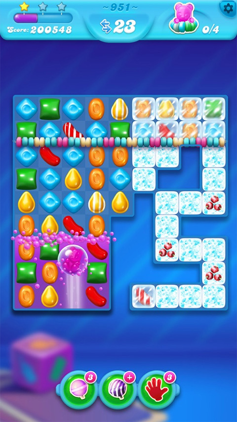 2、蜂蜜模式:目的是解救糖果熊,糖果熊被困在蜂蜜里面了。要先消除蜂蜜边上的糖果,让蜂蜜散了。每个空格显示的蜂窝数量表示完全消除蜂蜜需要的消除次数!