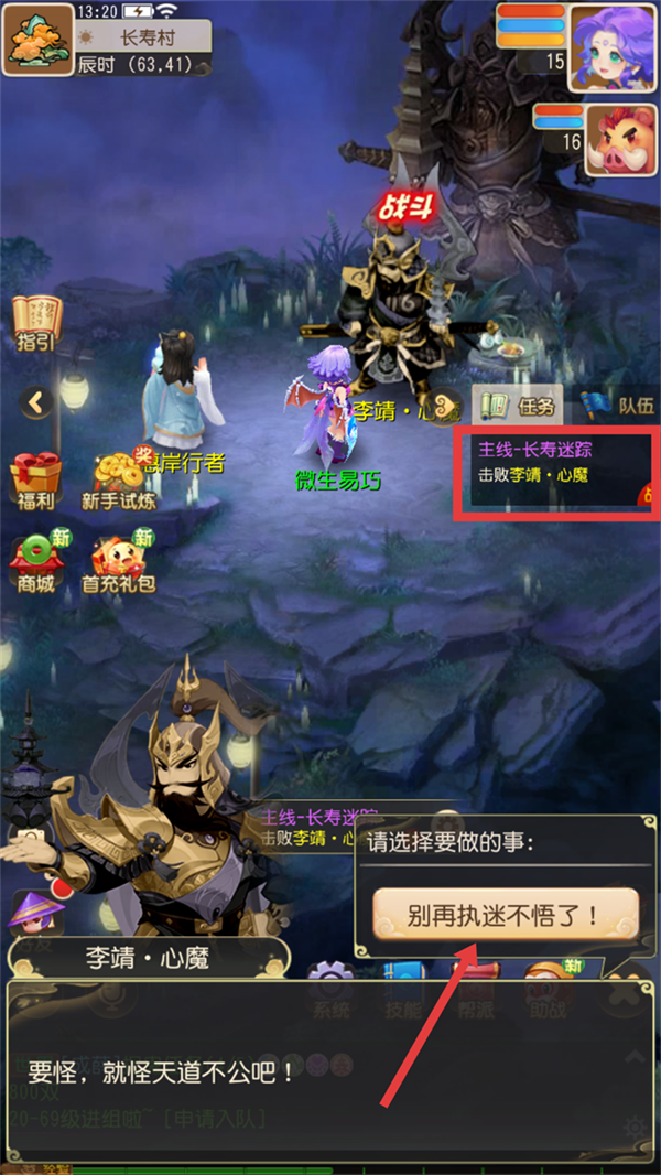 1、接取【主线-长寿迷踪】任务,面对【李靖-心魔】时,选择【别再执迷不悟了】即刻开启战斗。