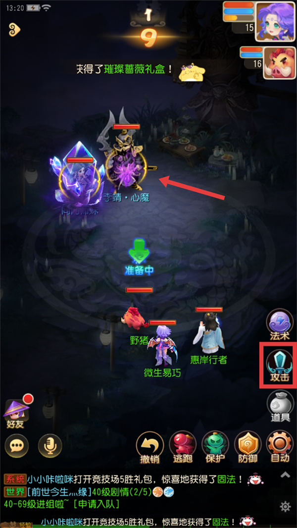 4、轮到【召唤灵】释放技能时,点击右侧【攻击】按钮,再点击攻击目标就行啦。