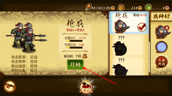 3、在兵种管理界面里找到枪兵,点击其对应的升级,消耗对应资源即可提升枪兵等级。