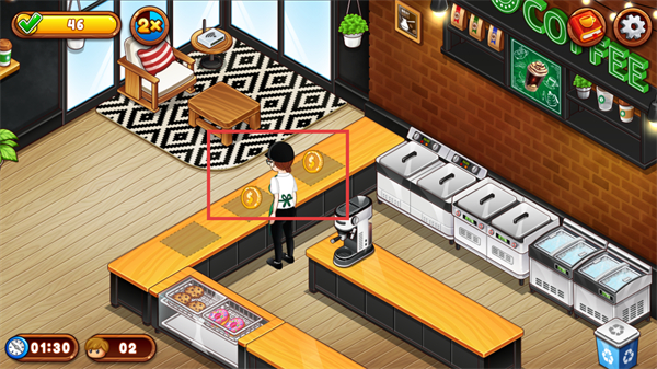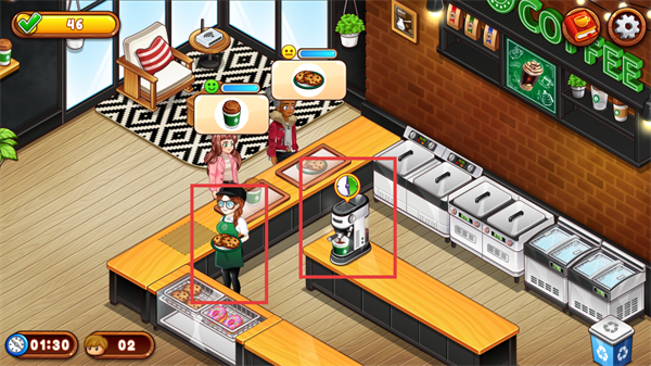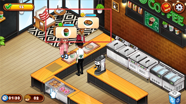 1、观察顾客需求,从展示柜取【咖啡】-【饼干】类餐品,快速响应订单避免等待超时。