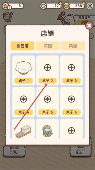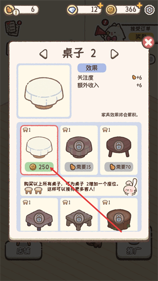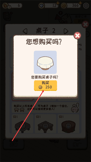 4、在购买确认弹窗中,点击“购买”按钮,消耗250金币完成桌子2的购买,增加店铺座位数。