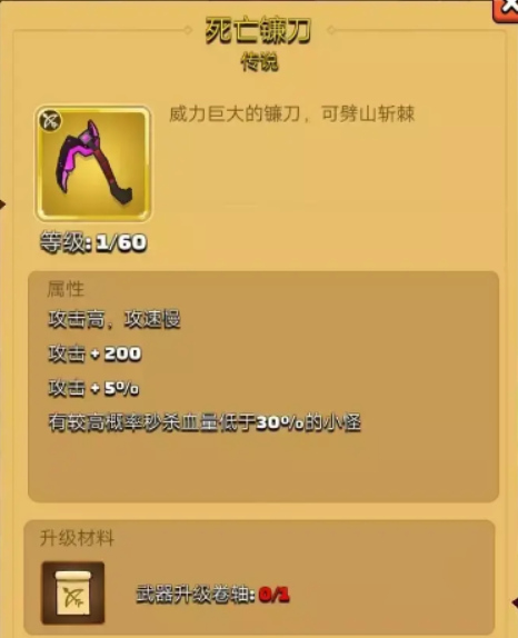 第四个名为镰刀,它是一个非常大的紫黑色镰刀,可以给敌人造成超高的伤害,攻击加200,在游戏中是唯一一个有着大概率秒杀血量低于30%的小怪的一个武器,它在游戏中虽然攻速比较慢,但是它的攻击伤害很高,并且有着所有武器中最强的击退效果,另外它的关卡伤害也是比较高的,若是在游戏中击中怪物能直接对该怪物造成超高的硬直效果,是游戏中最适合收割的一个武器,但就是大家带上了冰冻剑这个技能的话,就不太适合与它进行搭配了,会导致该武器的各项属性降低,带来减益效果,所以推荐大家这个武器与该技能的话,二者选一就可以了。