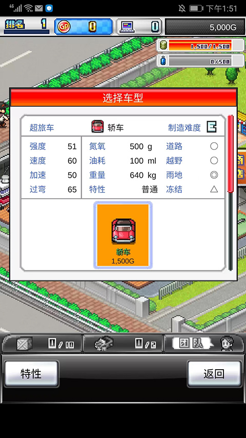 6、不同的车型性能也会不同,随着游戏的发展可以制造性能更好的赛车,这里以【轿车】为例,