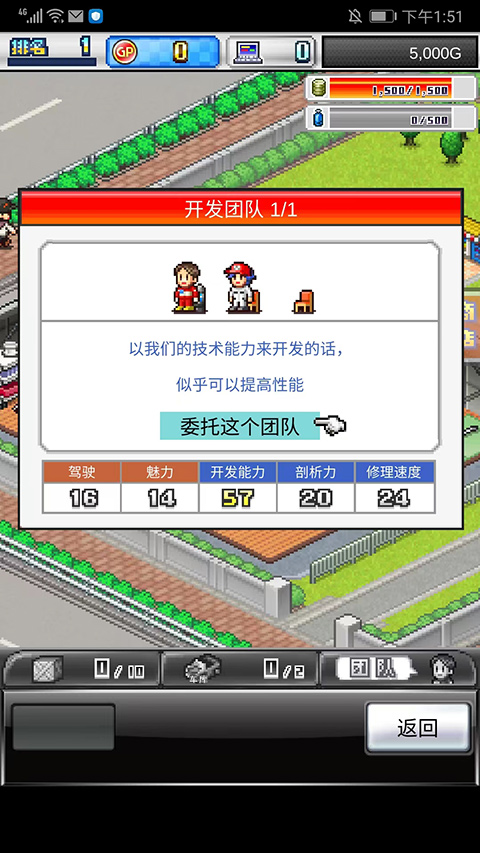 7、需要选择一个开发团队来进行设计,开发能力越高的团队,开发设计出来的赛车性能也就越好,可查看该团队的驾驶、魅力、开发能力、剖析力以及修理速度等参数来进行判断,确认好团队后,选择【委托这个团队】选项,