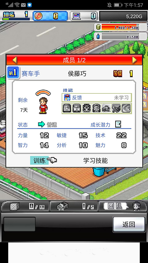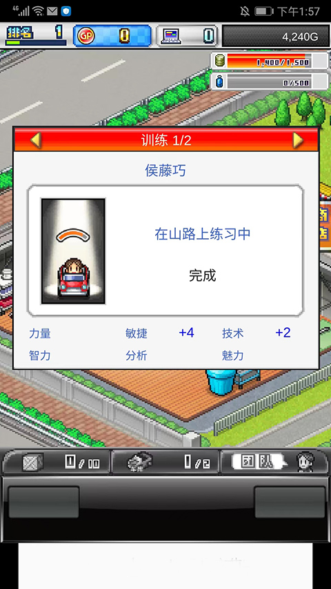 15、训练完成后,可以看到赛车手所提升的属性,游戏中玩家需要不断制造、升级性能更好的车以及训练赛车的能力,从而使在赛车比赛中可以获得更好的名次,收获更多的奖金,以上就是冲刺赛车物语2的玩法了。