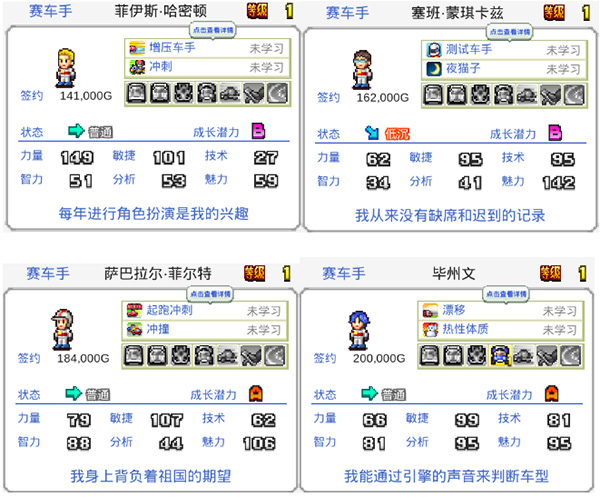 先说赛车手,赛车手的属性主要有油门、换挡、转向、魅力、技术和分析组成。