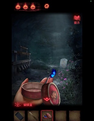 17、回到大门处,使用【胭脂盒】点击蓝,获得【蝴蝶盒】,带着【蝴蝶盒】回到花园,放飞蝴蝶,蝴蝶会停留在花朵上,用物品栏中的【锋利铜尺】取下,获得【冥陀兰】。