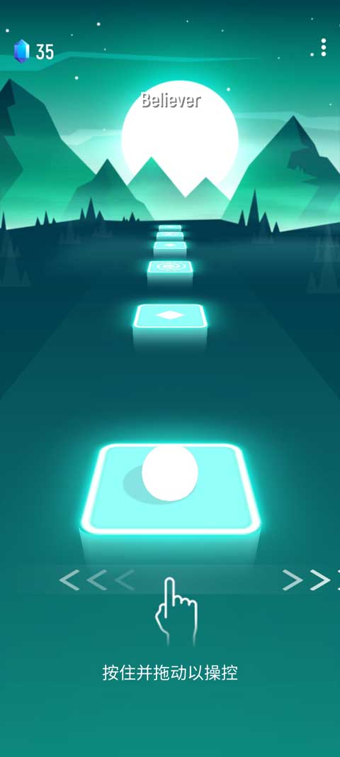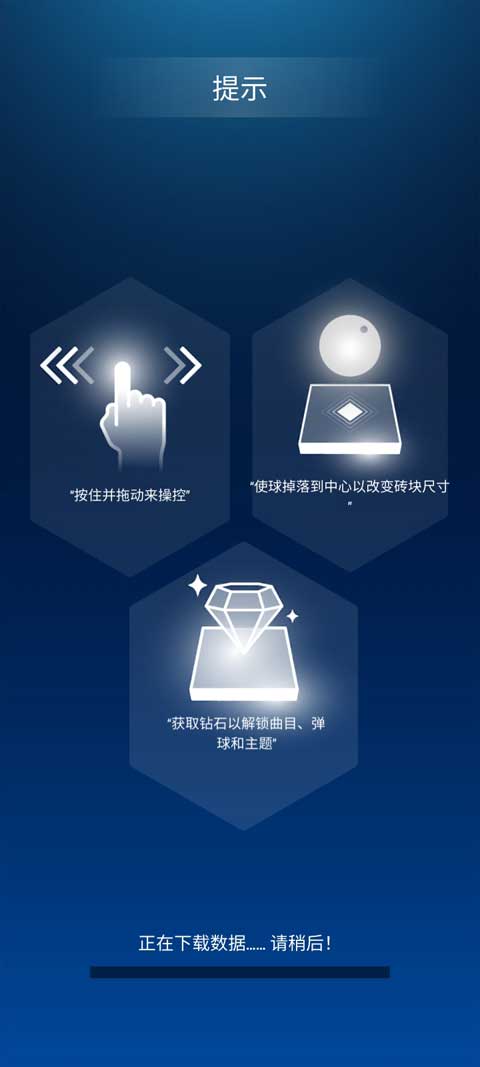2、游戏的玩法非常简单,就是按住并拖动球体来进行操控,同时使球体掉落到中心位置以改变砖块尺寸,最后就是获取钻石来解锁曲目、弹球和主题。