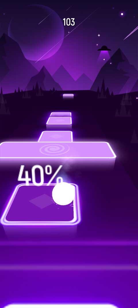 3、下面正式开始歌曲关卡,玩家在控制球体左右移动的过程中,还需要收集黄水晶,并且当玩家跳跃到一段道路时,方块上方会显示当前的进度。