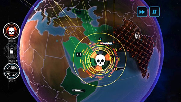 还提供了一个非常简单粗暴的核战模型,玩家不需要控制外交、经济和指挥常规战斗,只要研究科技,制造并发射导弹,然后占领无人控制的地区即可。当敌方的导弹经过上空时,可以使用巡航导弹拦截。如果有足够多的导弹可以打击某一关键地点,你可以用饱和打击功能将这些导弹全部射向目标,随着手机上地球的震动,一大片区域会被摧毁。