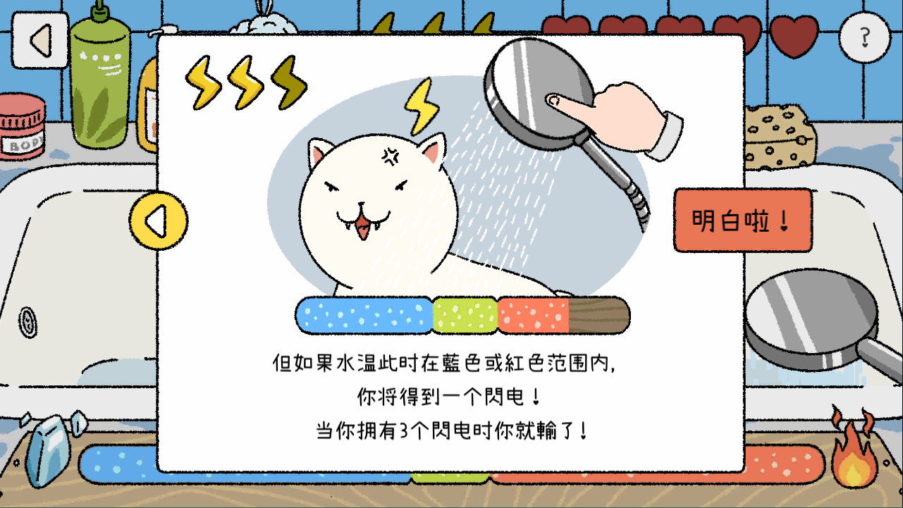 ④给喵喵洗澡,需要通过手机的陀螺仪来左右控制喵喵洗澡的温度,这个做得不是很好,太敏感了,操作的体验不是很顺滑,要洗的次数也有点太多,建议作者可以考虑,做成点击上面的小玩具与猫互动来,控制温度不是很真实,体感也不好。