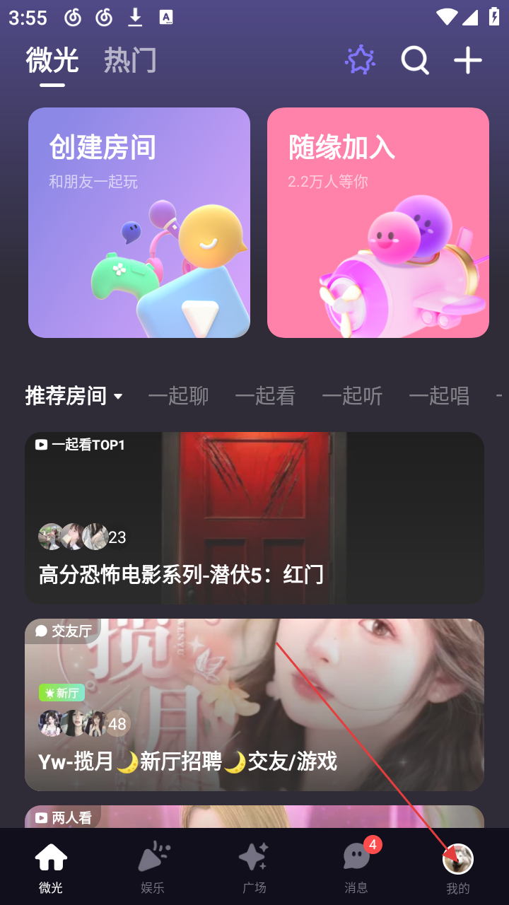 1、打开微光APP,进入首页后,可看到【创建房间】【随缘加入】等板块,点击右下角【我的】,进入个人页面。