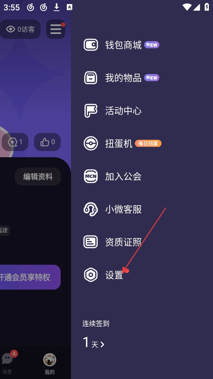 3、侧边栏展开后,有【钱包商城】【我的物品】等多个选项,点击【设置】选项,进入设置页面。