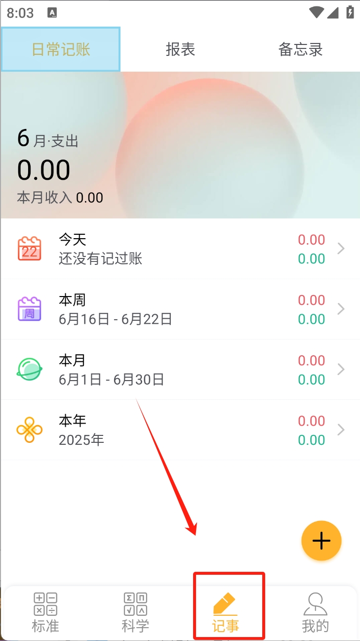 3、开始记账:点击“记事”按钮,进入记账应用开始记录收支。