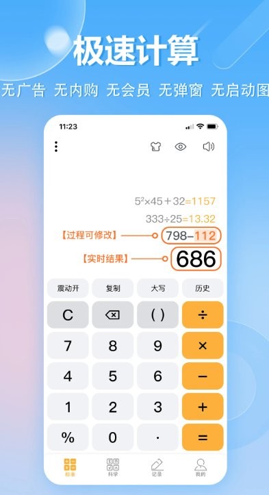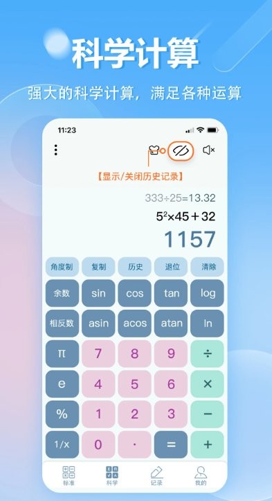 3、极简交互界面采用符合人体工学的按键布局,支持横竖屏自动切换,历史记录悬浮显示,实现高效无干扰的计算体验。
