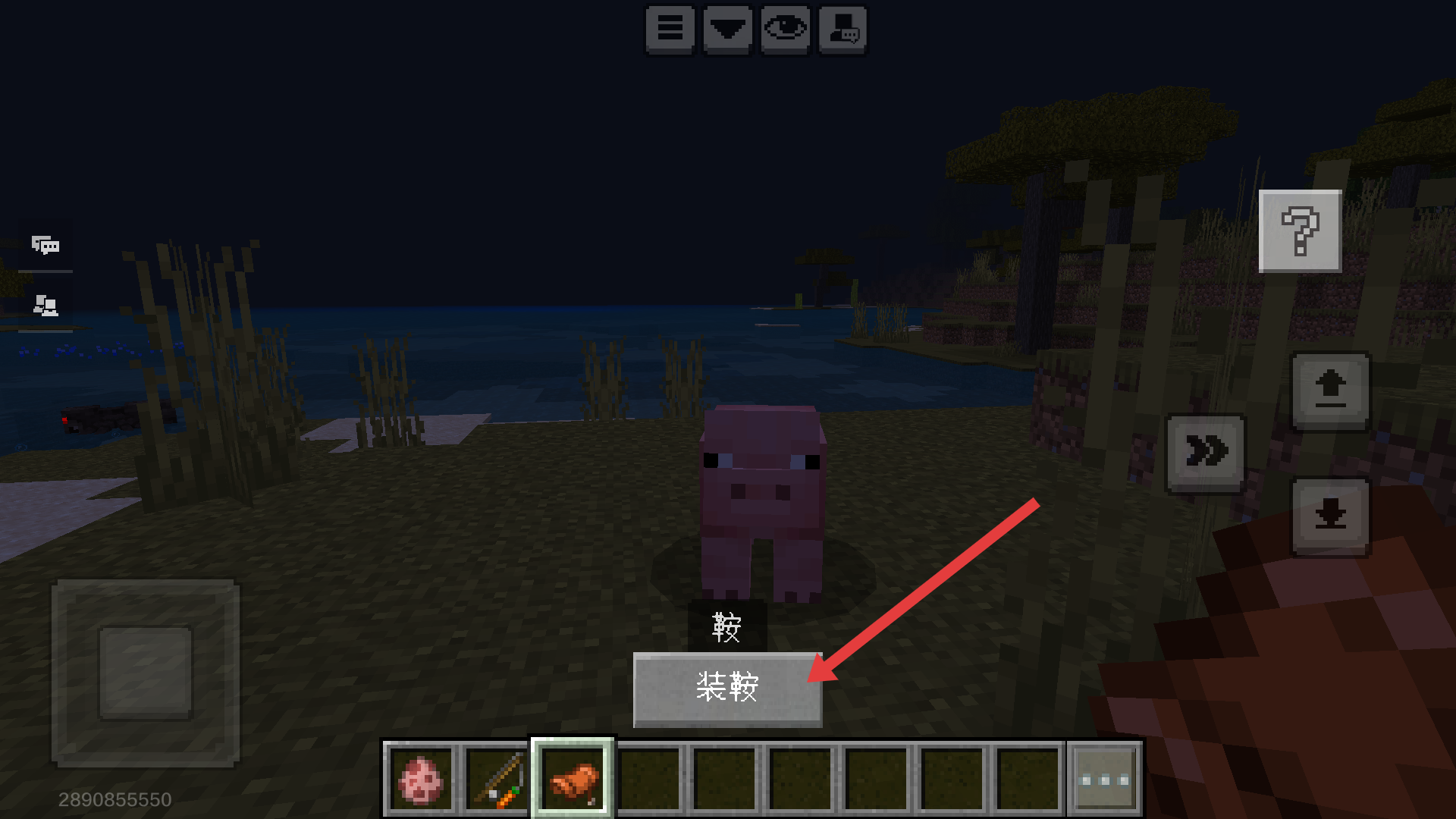 1、找到猪后点击【装鞍】,为猪装备鞍,这是骑乘的前提步骤,做好准备再出发呀。