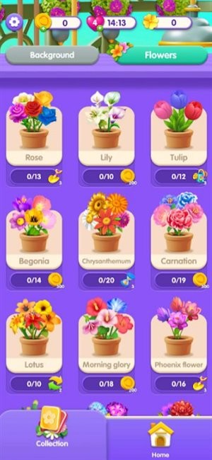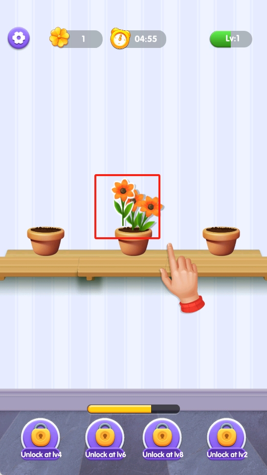 2、闯关收集:游戏融合了闯关和收集元素,玩家需要将花盆中的花朵按类型拖入花盆中进行消除。