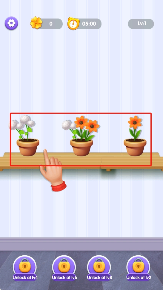 2、移动花卉:将花盆中的花朵按类型拖入花盆中,进行合并消除。