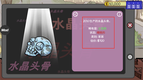 4、关注物品信息,如【2010生产的水晶头骨】,其稀有度少见、状态糟糕、类别家居、估价$720,据此判断交易策略。