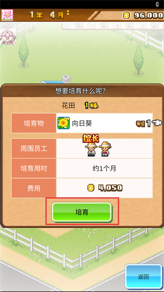 3、选定【向日葵】后点击【培育】按钮,消耗对应费用,启动培育流程,等待作物成长周期结束。