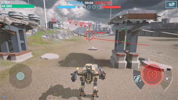 1、操控机甲移动,瞄准远处敌方目标,准备发起攻击,推进战斗进程。