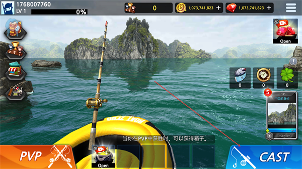 1、在初始界面点击CAST抛钩入水,开启垂钓流程,准备钓取鱼类。
