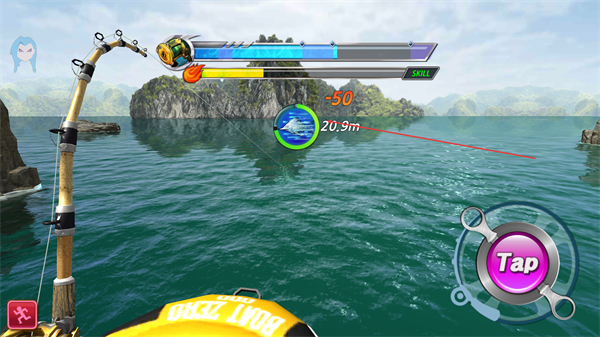 2、鱼咬钩后点击Tap收线,消耗体力值拉扯,逐步拉近鱼的距离。