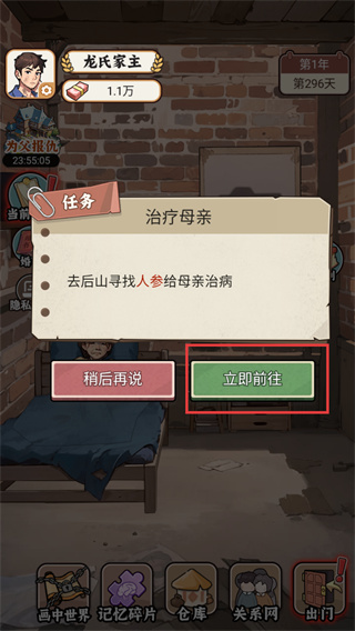 2、接取【治疗母亲】任务后,点击【立即前往】按钮,前往后山场景执行寻找人参的任务。