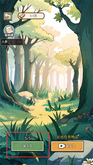 3、进入后山场景后,点击【采1次】按钮进行采集,逐步完成【人参-0/1】的任务物品收集目标。