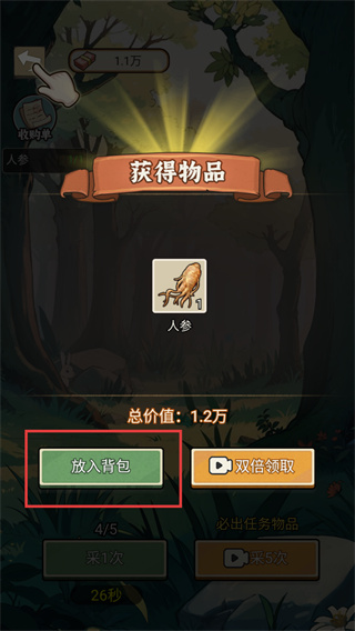 4、采集获得【人参】后,点击【放入背包】按钮,将物品存入背包,以便后续用于完成任务。