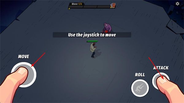 1、找到界面左侧标注MOVE的摇杆,用手指操作该摇杆,控制角色向目标敌人的方向移动。