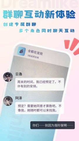 2、该软件更是支持拉多个AI角色进群,设置关系与剧情背景,AI 自主对话演绎故事线,拓展社交玩法。