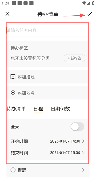 3、在待办清单编辑页面填写任务内容等信息后,点击右上角的对钩按钮完成待办添加。