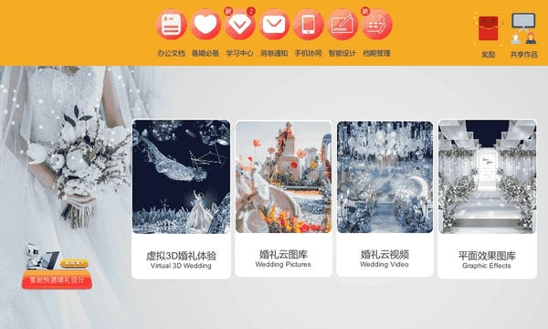 集成3D婚礼设计工具,支持5分钟快速生成个性化3D婚礼效果图,可自定义场景布置等细节,直观呈现新人理想婚礼场景,大幅缩短方案制作时间。