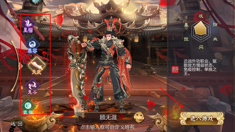 2、在角色选择界面,选定对应职业角色,确认角色名称后,点击界面的“进入游戏”按钮,进入游戏主场景。