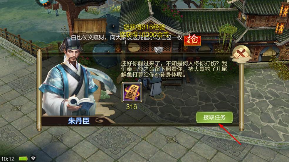 3、进入场景后,查看朱丹臣的对话弹窗,点击弹窗中的“接取任务”按钮,获取对应的任务及经验奖励。