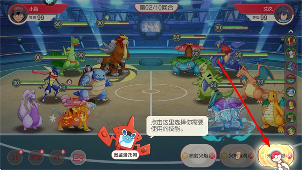 2、进入对战回合后,先选定宝可梦的技能,再选择该技能要作用的敌方目标宝可梦。