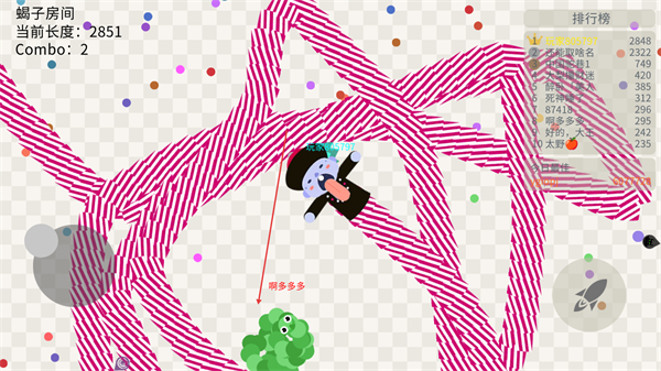 2、利用自身蛇身的缠绕路径,避开其他玩家的蛇身,持续收集圆点积累长度。