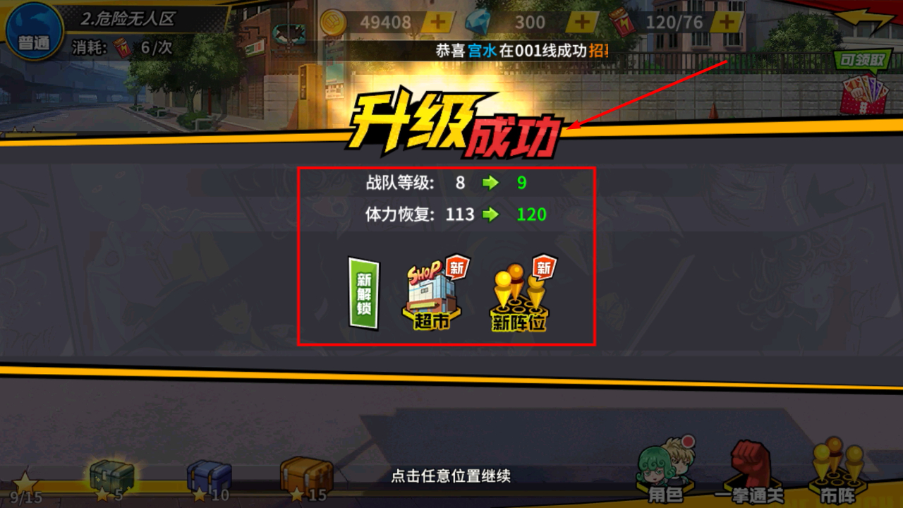 1、战队等级提升到9级后,体力恢复增加至120,解锁超市和新阵位功能,可继续参与关卡挑战获取更多资源。