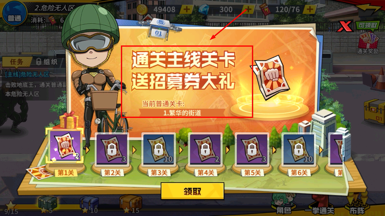 2、通关主线关卡如繁华的街道,可获得招募券大奖,完成当前关卡任务能推进游戏进程并积累招募道具。