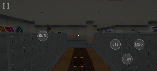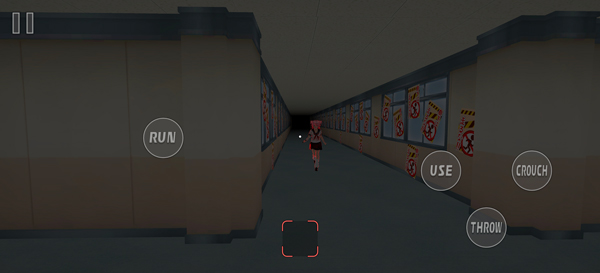 3、游戏采用第一人称视角,左侧虚拟轮盘控制角色移动,RUN为奔跑键,USE拾取互动键,CROUCH蹲下键;