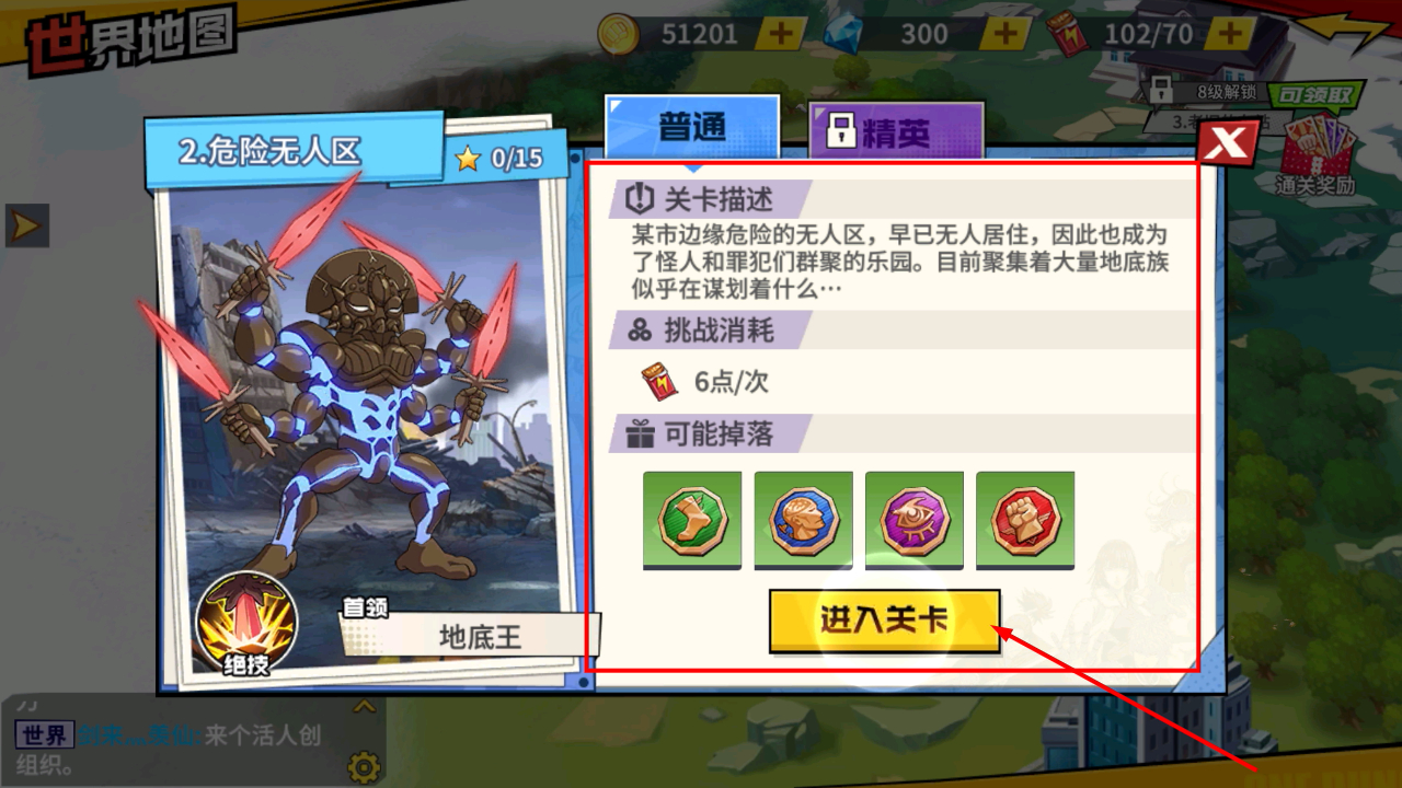 1、新章节开启后,可前往【危险无人区】区域,点击对应位置开启普通难度的关卡挑战。