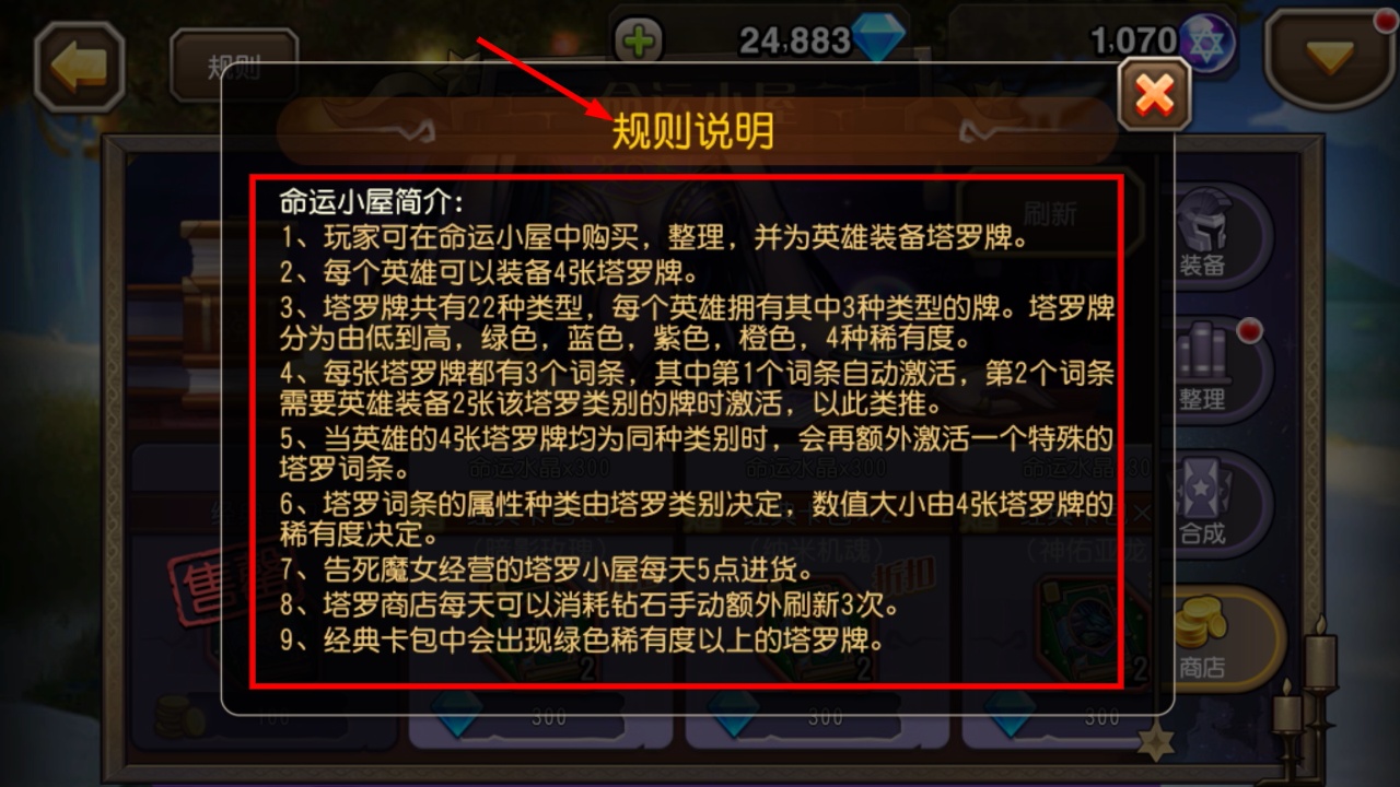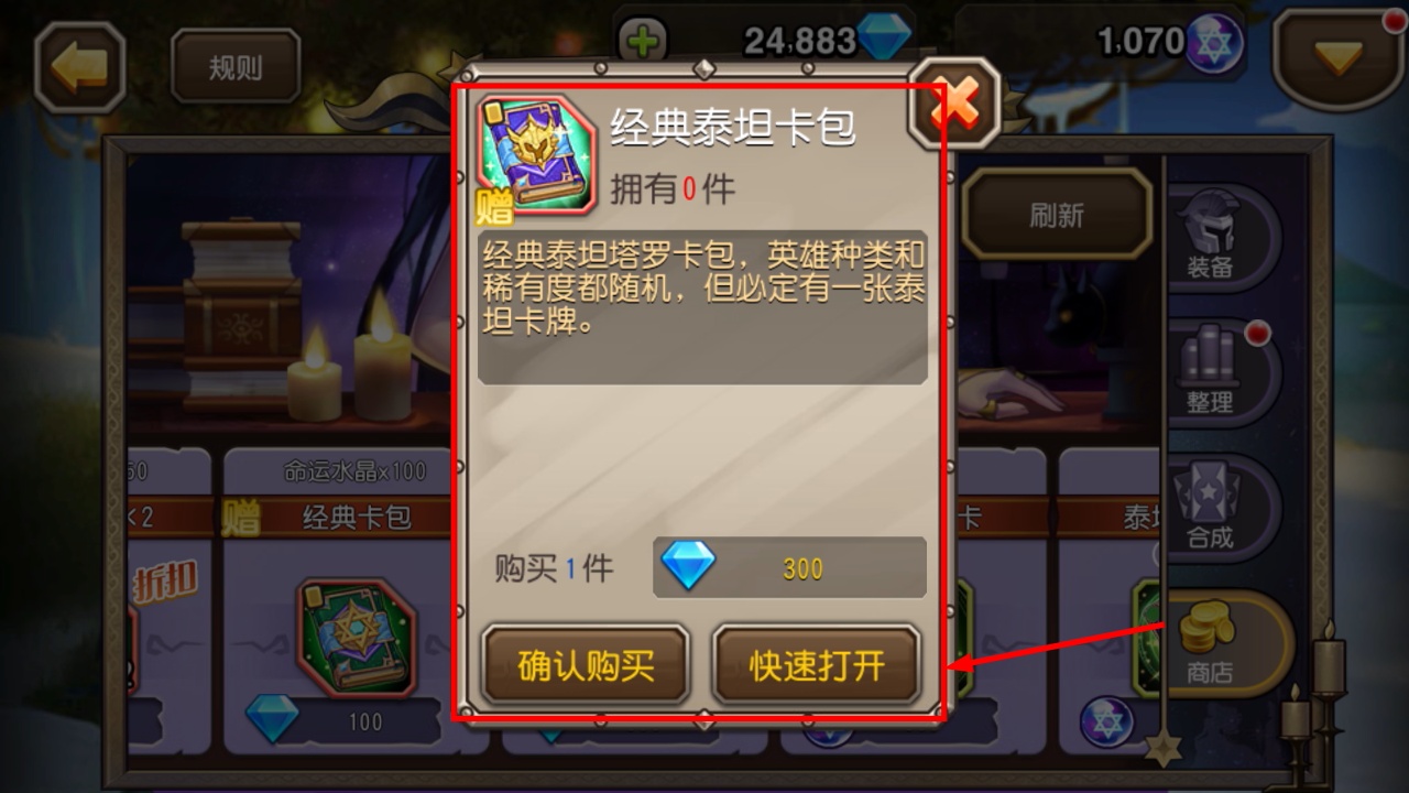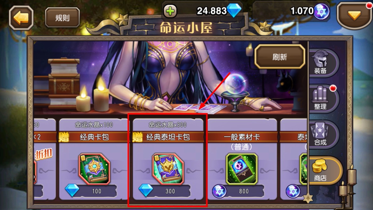 2、命运小屋内消耗300钻石购买经典泰坦卡包,能获取命运水晶,同时开出泰坦类塔罗牌助力英雄配置。