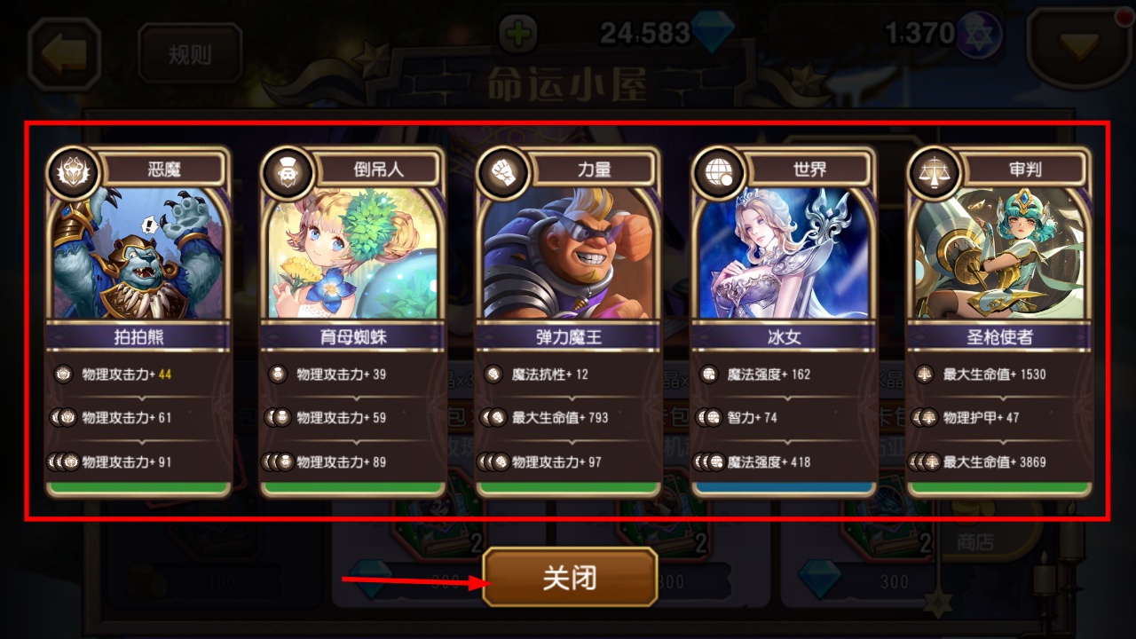 4、不同塔罗牌对应不同属性加成,如恶魔加物理攻击、冰女加魔法强度,需结合英雄定位选择适配卡牌。