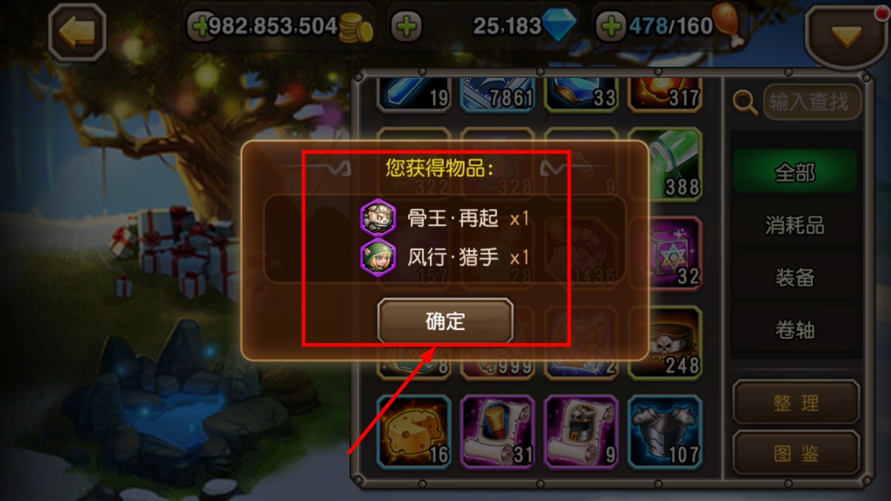 2、开启宝箱后获得【骨王·再起】和【风行·猎手】,及时确认领取奖励,为角色搭配新神谕做准备。