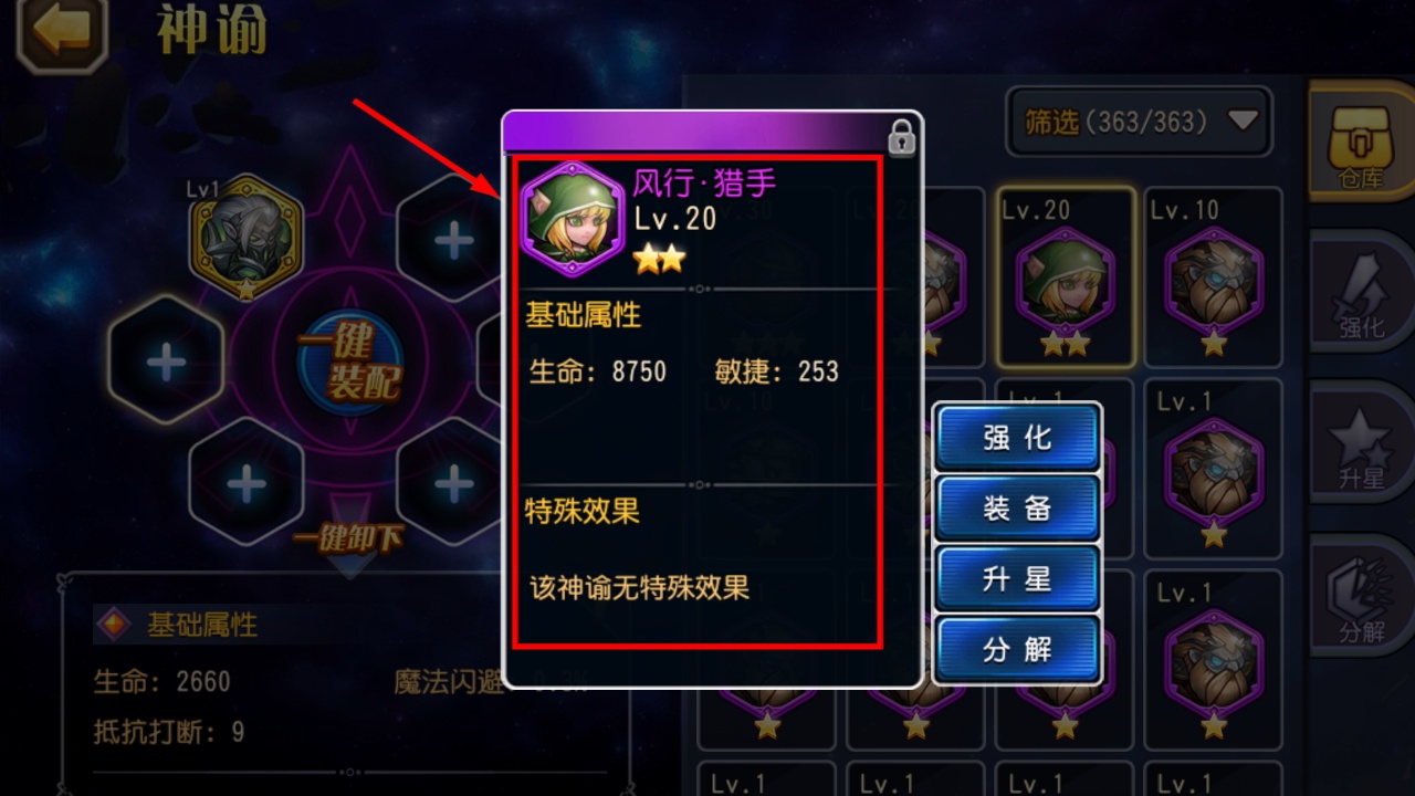 3、查看新获【风行·猎手】属性,等级20二星生命8750敏捷253,通过一键装配快速强化角色。
