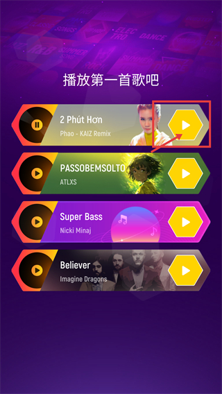 1、在歌曲选择界面,点击被框选的【2-Phut-Hon】对应的播放按钮,进入该歌曲的节奏关卡,开启音乐互动挑战。