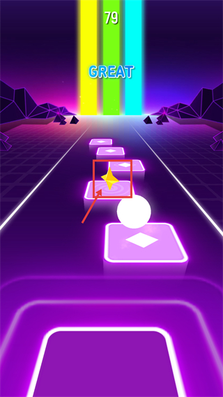 3、当球体移动至被框选的音符区域时,触发节奏判定,获得【GREAT】评价,分数提升至79,推进关卡进度。