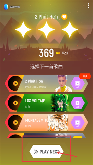 4、歌曲结束后显示分数369,点击被框选的【PLAY-NEXT】按钮,进入下一首歌曲的节奏关卡,继续挑战。